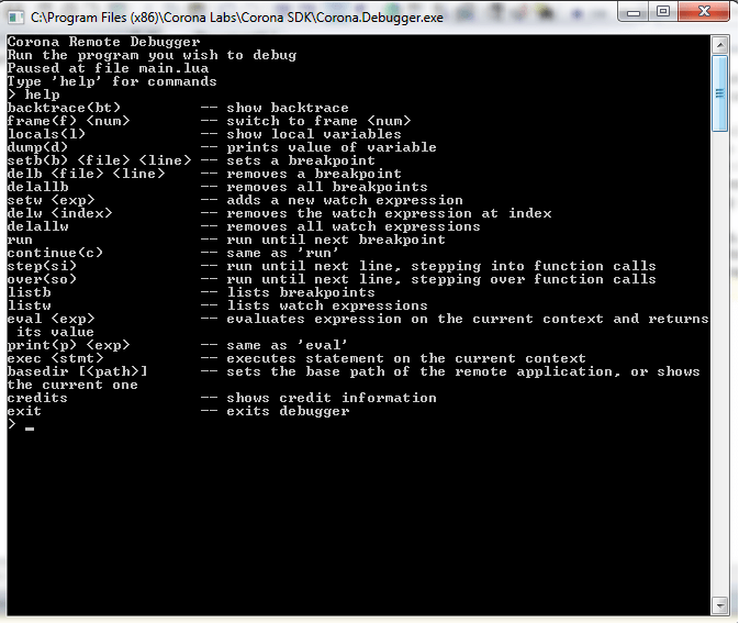 Corona Debugger’ı çalıştırmak için Corona SDK klasörünüzü açıp, Corona Debugger dosyasını açıyoruz. Bir simülasyon penceresi, debugger’ın çalıştığı bir dos penceresi ve bir de simülatör çıktılarını görebileceğiniz Corona Simülatör penceresi açılır. Simülasyon penceresini açıp File – Open Project’ten projenizin main dosyasını çalıştırdıktan sonra debugger penceresine döneceğiz. Debugger’ın komutlarını görmek için komut satırına help yazıp enter’a basıyoruz.